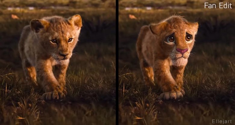 Originalmente dublado por Jonathan Taylor Thomas e Matthew Broderick, Simba foi dublado por Donald Glover no remake do diretor Jon Favreau – e ele parece diferente também. Acabaram-se os movimentos exagerados dos olhos, inclinações da cabeça, estremecimentos e sorrisos que Simba expressou na animação dos anos 90, e aqui está um leão que parece real o suficiente, mas não é tão emotivo. Mochkin devolveu a assinatura de Simba ao retrabalhar o design do personagem, adicionando as sobrancelhas viradas para baixo quando o jovem filhote de leão sabe que ele está com problemas e olhos arregalados quando olha para a vastidão do reinado, onde tudo que a luz toca é o seu reino para governar.