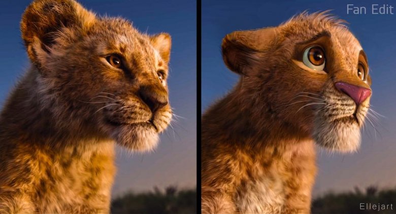 Originalmente dublado por Jonathan Taylor Thomas e Matthew Broderick, Simba foi dublado por Donald Glover no remake do diretor Jon Favreau – e ele parece diferente também. Acabaram-se os movimentos exagerados dos olhos, inclinações da cabeça, estremecimentos e sorrisos que Simba expressou na animação dos anos 90, e aqui está um leão que parece real o suficiente, mas não é tão emotivo. Mochkin devolveu a assinatura de Simba ao retrabalhar o design do personagem, adicionando as sobrancelhas viradas para baixo quando o jovem filhote de leão sabe que ele está com problemas e olhos arregalados quando olha para a vastidão do reinado, onde tudo que a luz toca é o seu reino para governar.