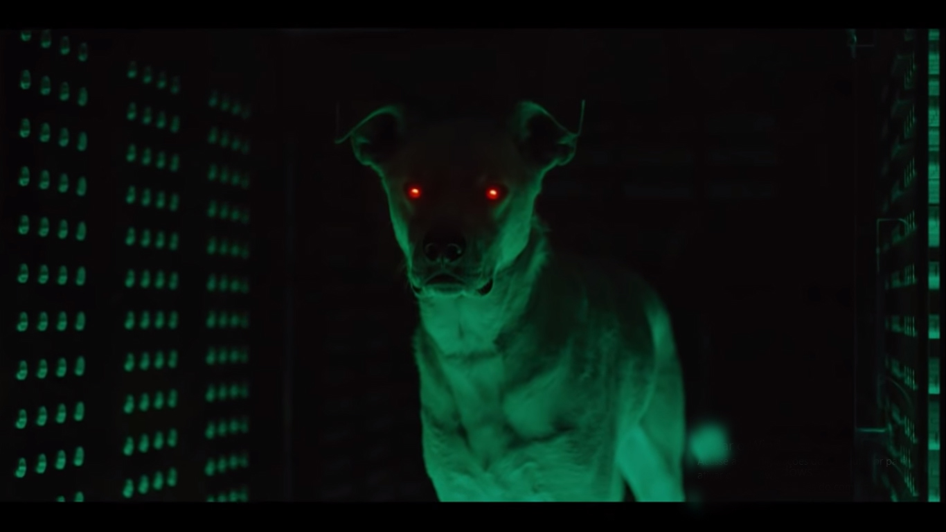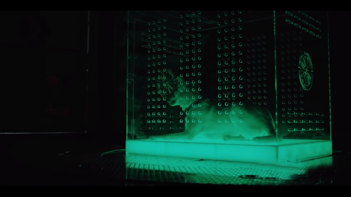 Ao se aproximar do animal, vemos um símbolo bastante familiar nos ombros desse peladão: o símbolo do Superman. Quando ele solta o cachorro da jaula, seus olhos brilham um vermelho forte, dando a entender que ele tenha sido “ativado”.