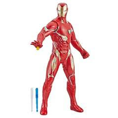 Homem de Ferro Figura Eletrônica Deluxe com aproximadamente 33 centímetros inspirada no filme “Vingadores: Ultimato”. Emite sons e frases e apresenta mecanismo de rotação que permite lançar projétil em um incrível movimento de combate giratório (inclui projétil).